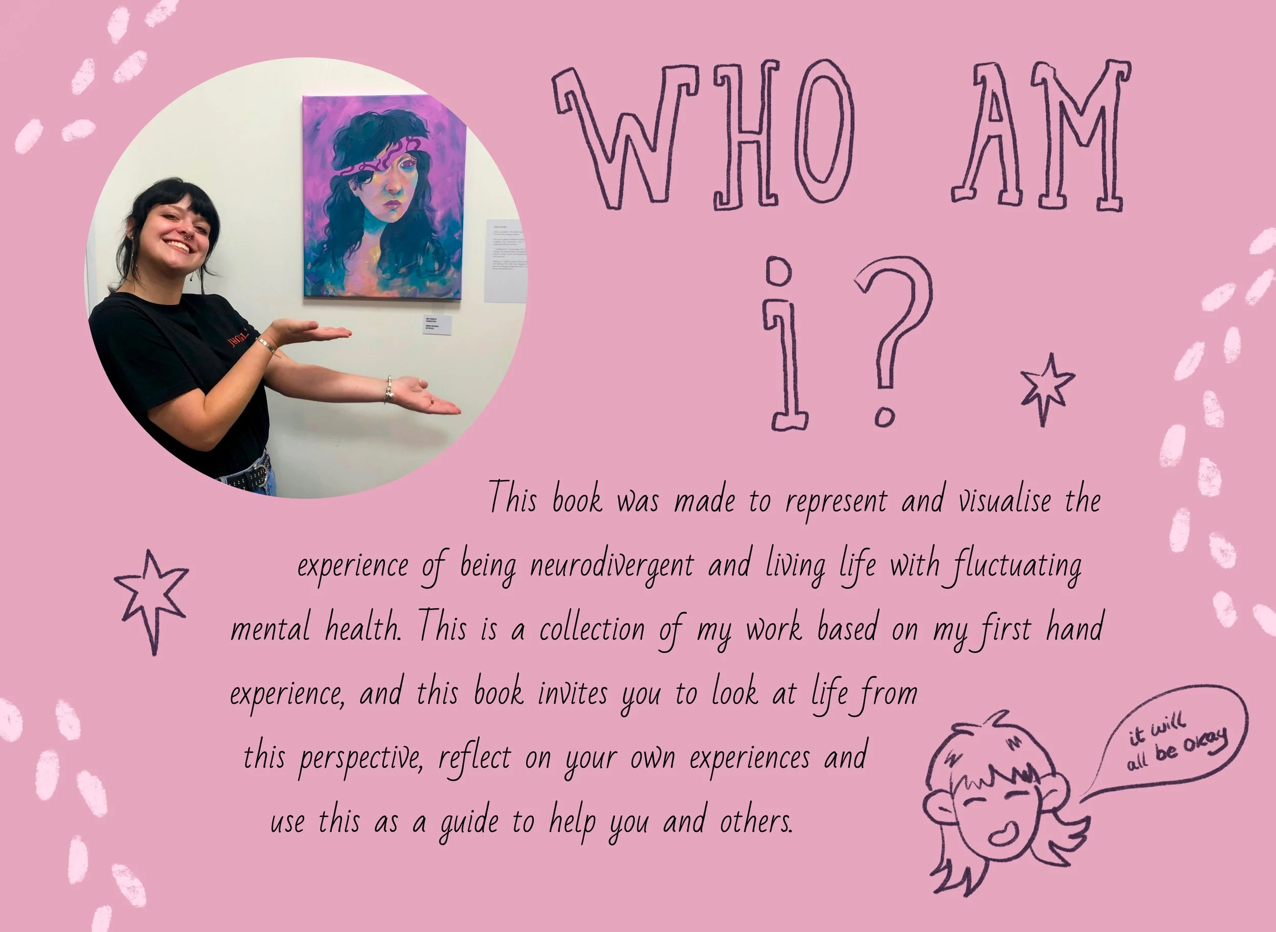 My handmade book, ‘Pieced Together’ explores the themes of fluctuating mental health, with each page visualising the experiences of different mental states and neurodivergence. The book and mirror installation was featured at the end of year degree show at Solent Southampton, as well as New Blood Festival 2025.